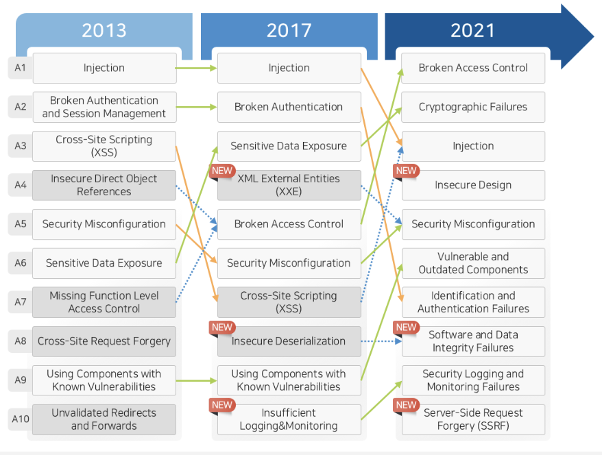 인젝션 공격은 OWASP Top10에 항상 상위권에 속해 있고, 주요정보통신기반시설 기술적 취약점 분석 가이드에서도 찾아볼 수 있다. (참고로 OWASP은 악용가능성, 탐지가능성 및 영향에 대해 빈도수가 높고 보안상 영향을 크게 줄 수 있는 10가지 웹 애플리케이션 보안 취약점 목록이다. 3~4년 주기로 발표된다.)