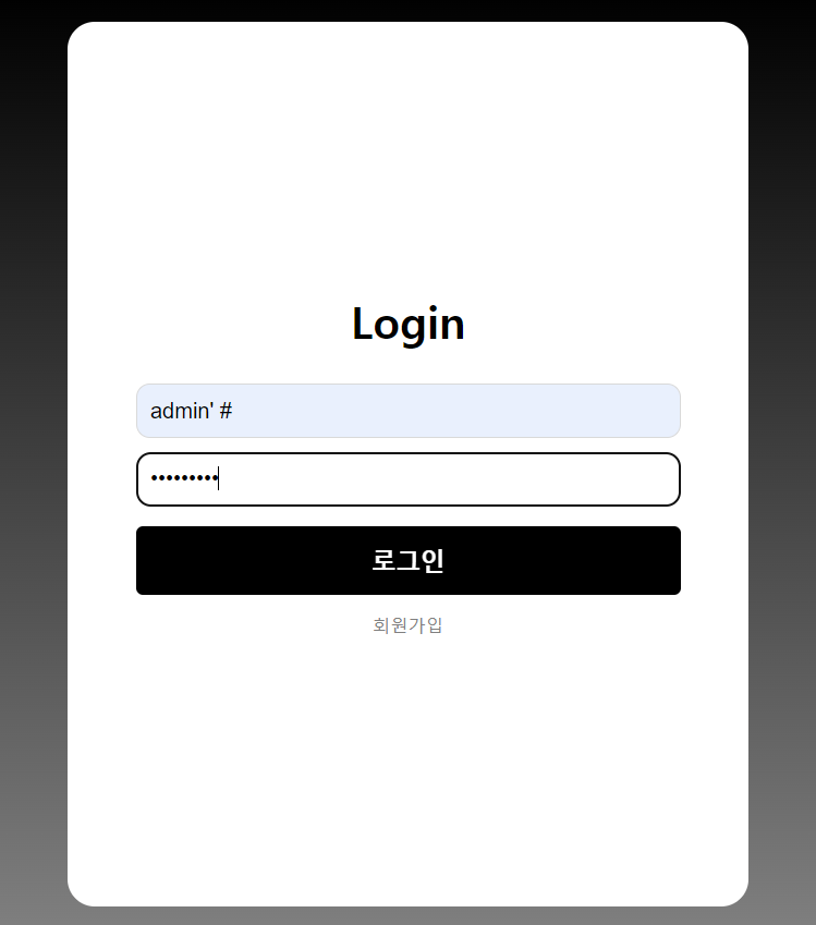 이제 진짜 로그인 우회 공격을 시도해보자. id에 ' or '1'='1' #, pw에 1234 (그냥 아무 숫자)를 입력하고 로그인을 해본다.