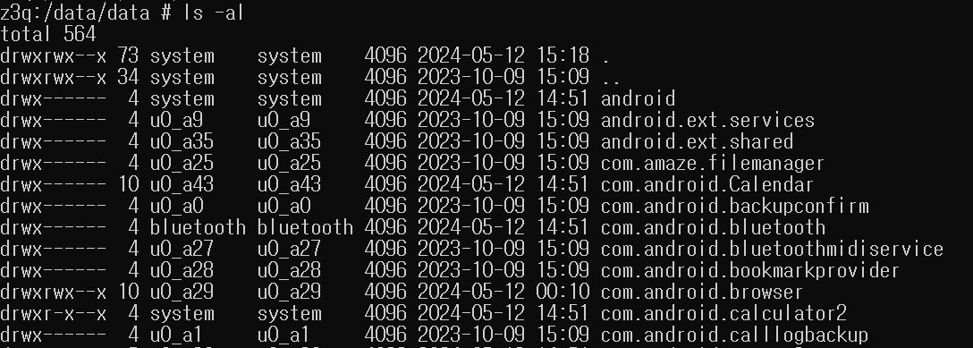 실제로 /data/data 디렉터리로 이동해보면 설치된 앱 패키지들이 다양하게 존재하는 것을 확인할 수 있다.