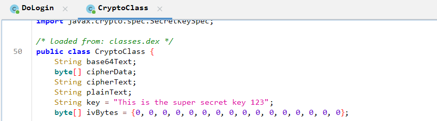 CryptoClass 파일을 확인하니 암호화키가 대놓고 평문으로 저장되어있는 것을 발견