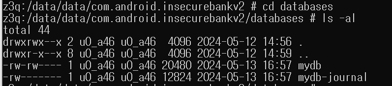 취약점 진단에 사용할 insecurebank 앱 패키지로 들어가보면 databases와 shared_prefs 디렉터리가 있는 것을 볼 수 있다.