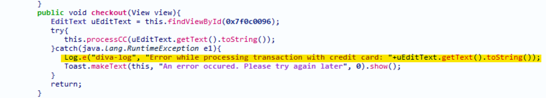 보통 개발자들은 개발 시 로그 정보를 통해 에러를 잡거나, 전송되는 정보들을 확인한다. 문제는 앱을 배포하기 전에 이런 로그 코드를 삭제해야 하는데, 삭제하지 않은 경우에 취약점이 발생하게 되는 것이다.