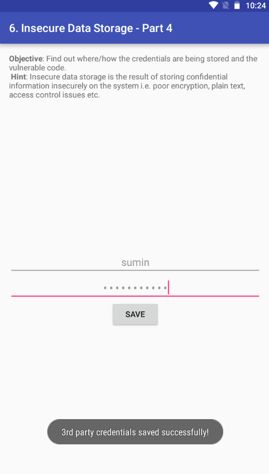 안전하지 않은 데이터 저장 Part 4는 Part 1 ~ 3과 다르게 외부 저장소에 중요 정보가 저장되는 취약점이 있다.