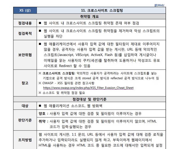 웹 취약점 진단의 기준이 되는 주요정보통신기반시설 기술적 취약점 분석 가이드에서도 크로스사이트 스크립팅을 찾아볼 수 있다.
